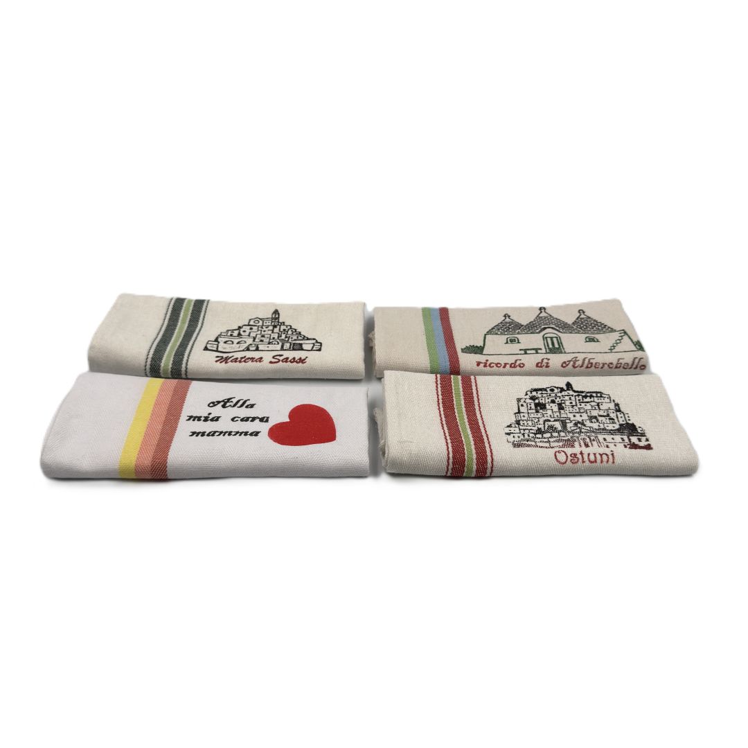 I nostri strofinacci rappresentano l’unione perfetta tra funzionalità e bellezza. Realizzati in tessuti di lino e cotone di prima qualità, offrono eccellente assorbenza e resistenza. Le personalizzazioni includono vedute cittadine, monumenti storici, ricette tipiche regionali e motivi folkloristici. Perfetti per negozi di souvenir nelle città d’arte, rappresentano un ricordo utile che accompagna i turisti nella vita quotidiana. Dimensioni standard e personalizzabili, confezionamento professionale incluso.